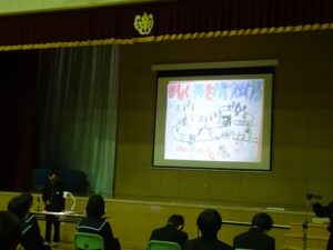 3月3日(木)、1年生は、総合的な学習の時間で発表会を行いました。今回のテーマは、「岩内町の魅力を生かした新たな町づくりを提案する」です。 子どもたちは、自分の考える魅力的な岩内町の絵やキャッチコピーが描かれた1枚のポスターをもとに、1人ずつ前に出て2分間という制限時間の中で個性あふれる提案を行いました。