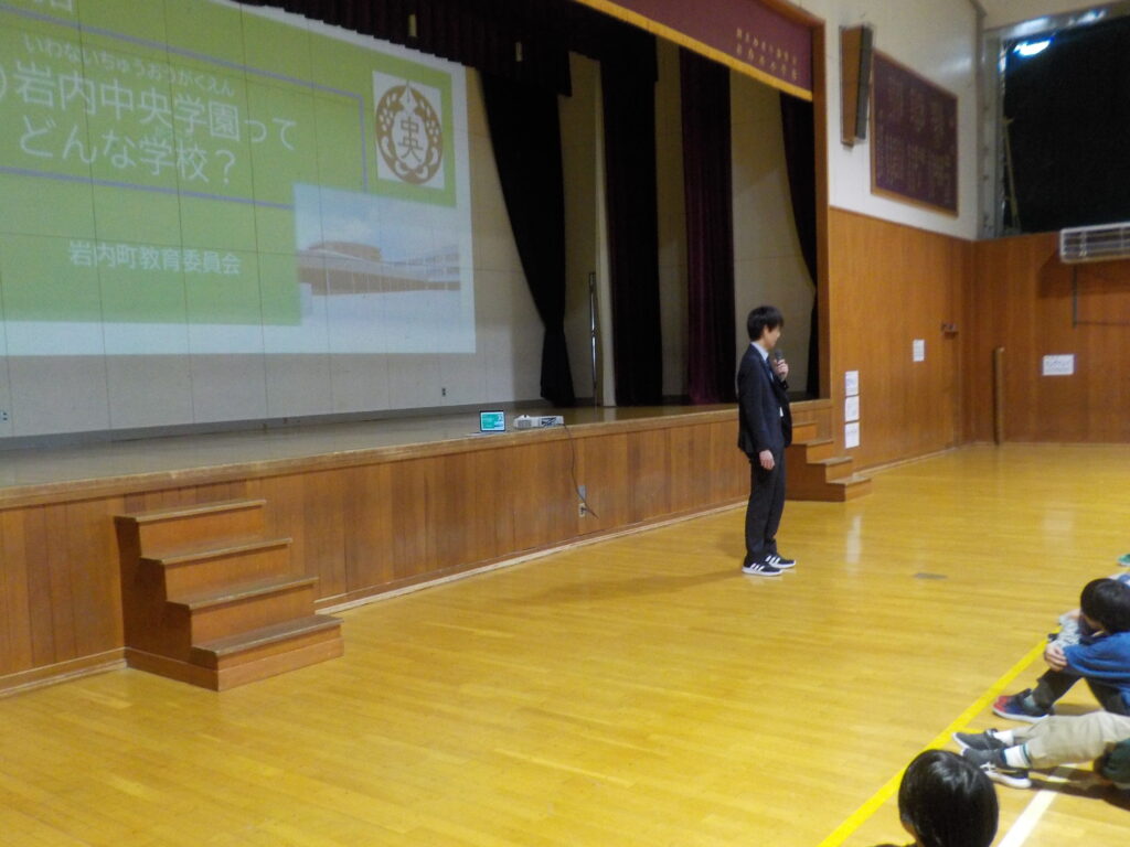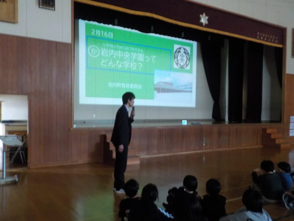 昨日、教育委員会の方が来校し、全校児童向けに岩内中央学園開校に向けた事前説明会を開きました。これまでの学校とどんなところが変わるのだろうという視点から、とてもわかりやすく、クイズも取り入れながら説明をしていただきました。
