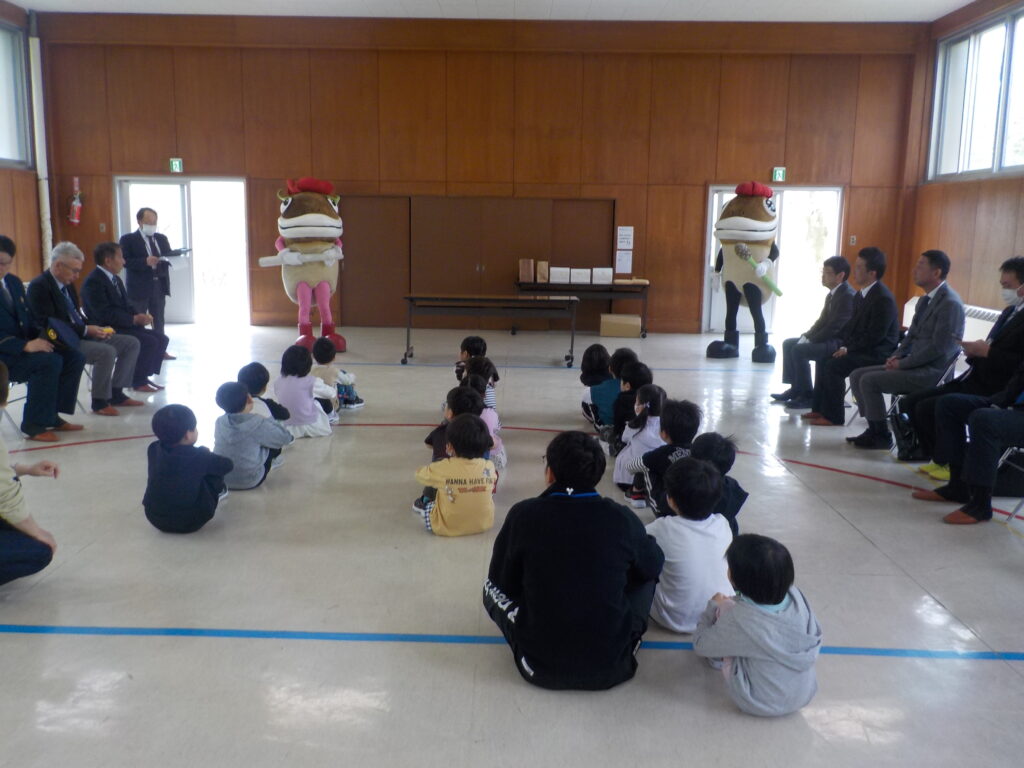 今日は、2時間目に防犯ブザー贈呈式がありました。1年生に警察署の方や教育長さんから防犯についてのお話がありました。岩内町だけなく、神恵内町、泊村、共和町からも校長先生も参加していただきました。スペシャルゲストにたら丸、べに子が登場し、子どもたちも大喜びでした。返事もきちんとして1年生はとても立派な態度でした。
